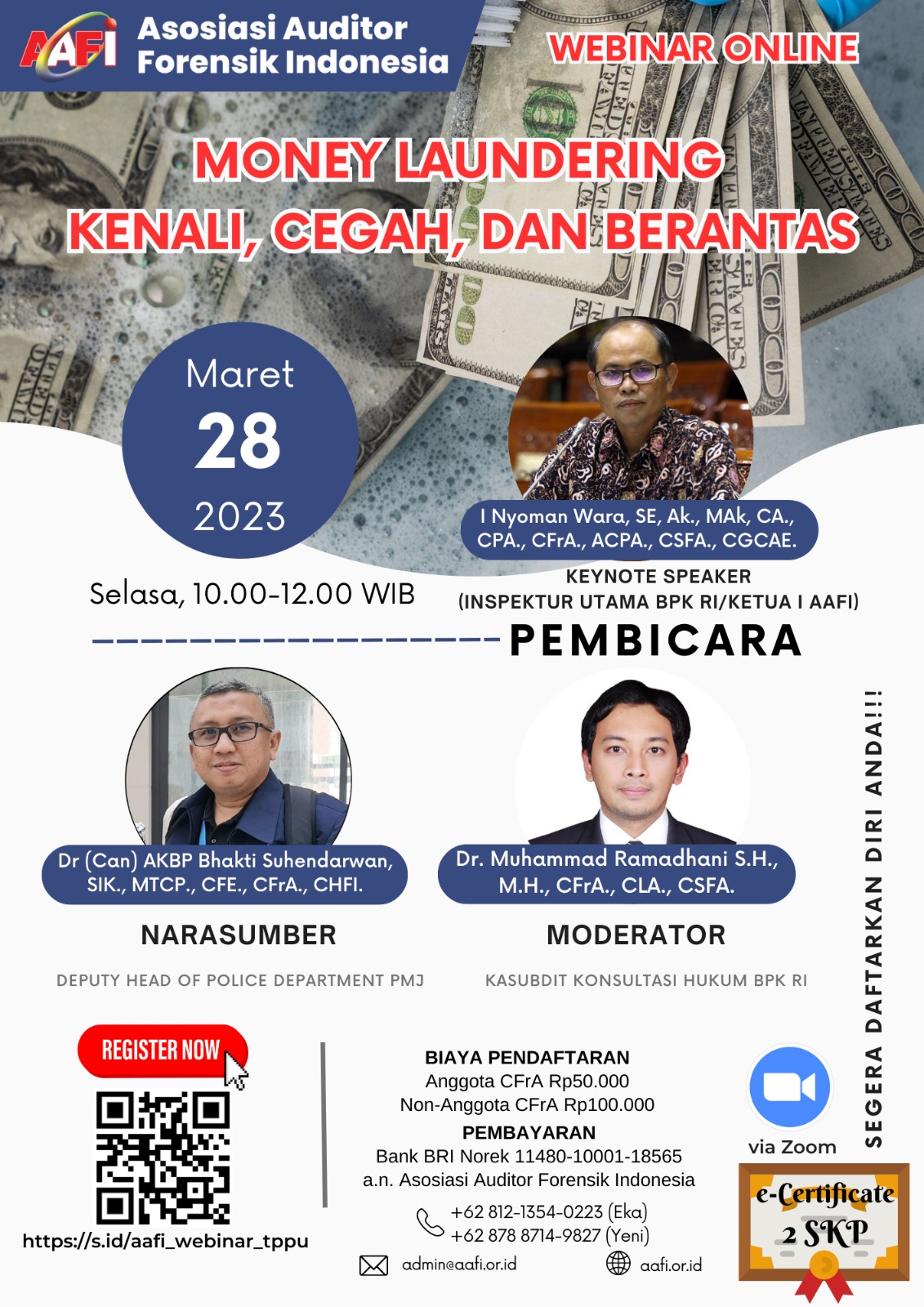 Asosiasi Forensik Auditor Indonesia (AAFI YIGI) mengundang Bapak/Ibu dalam Webinar Online dengan Tema MONEY LAUNDERING, KENALI, CEGAH, DAN BERANTAS