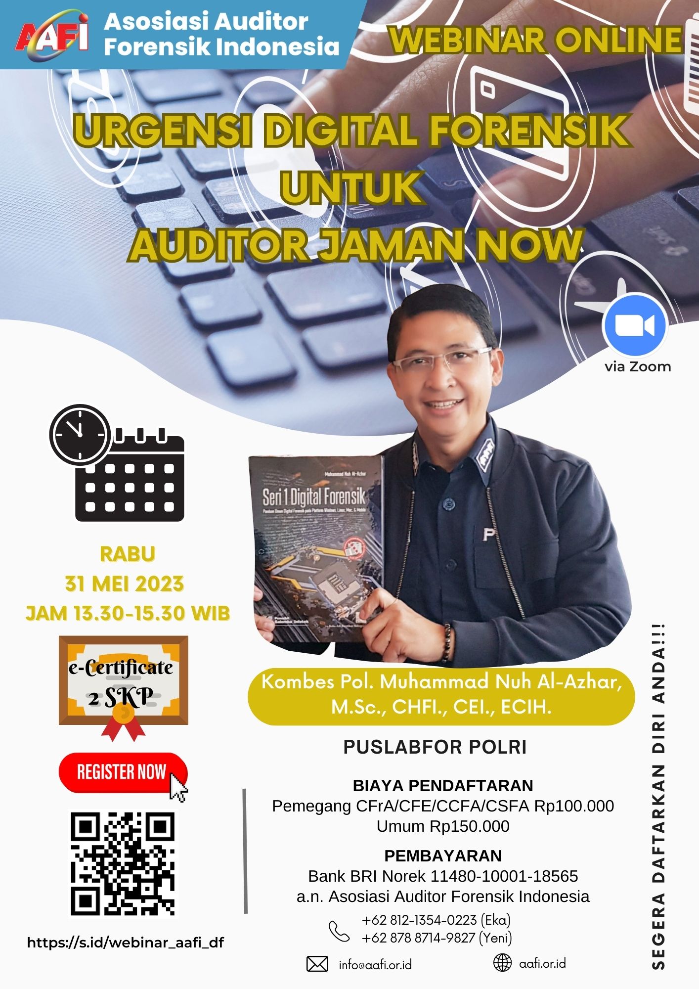 Asosiasi Forensik Auditor Indonesia (AAFI YIGI) mengundang Bapak/Ibu dalam Webinar Online dengan Tema "URGENSI DIGITAL FORENSIK UNTUK AUDITOR JAMAN NOW" yang menghadirkan Ahli Digital Forensik, Komisaris Besar Polisi Muhammad Nuh Al-Azhar, S.T., M.Sc., CHFI., CEI., ECIH. dari PUSLABFOR POLRI.